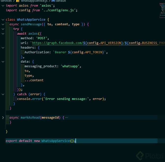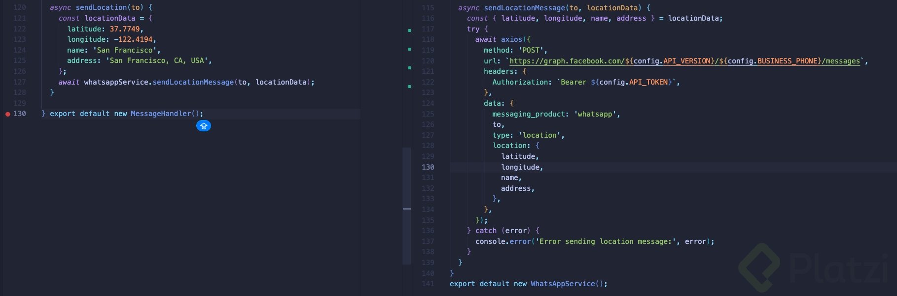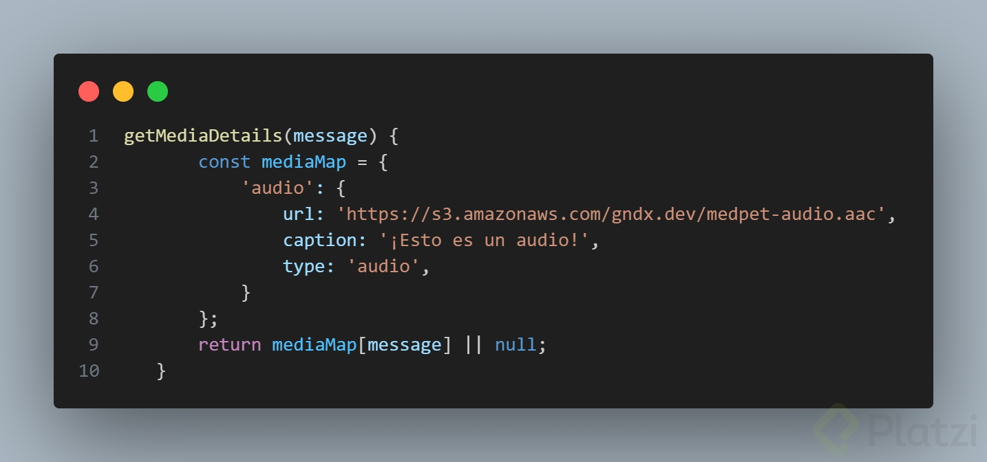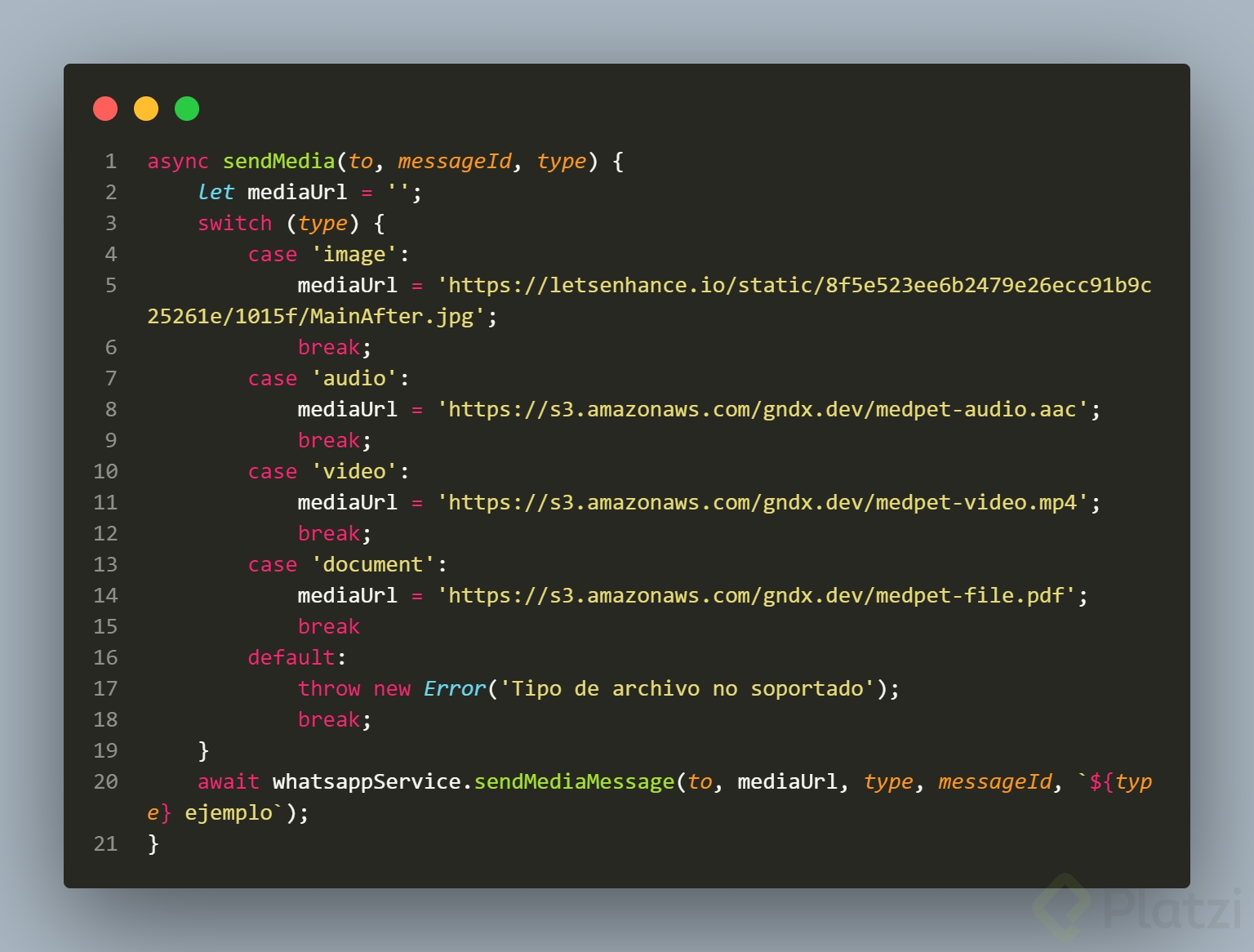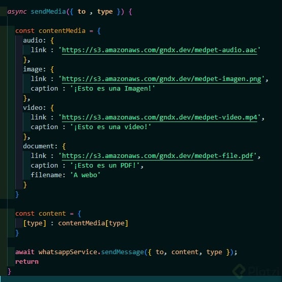 El código está organizado para enviar tipos específicos de medios (audio, video, imagen, documento) según la interacción del usuario. Por ejemplo, se muestra un flujo de código para enviar un audio:
