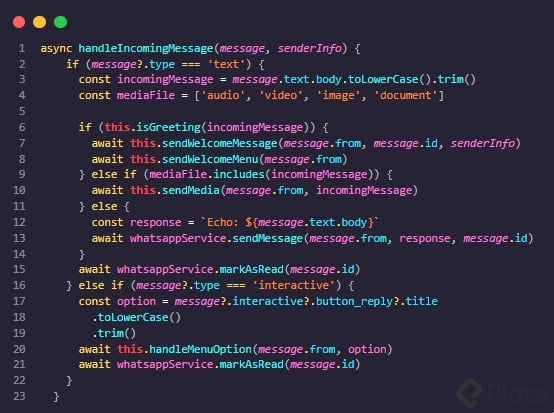 - Automatización contextual: Combina la lógica de comandos específicos con inteligencia artificial para ofrecer mensajes personalizados según el contexto o necesidad del usuario.