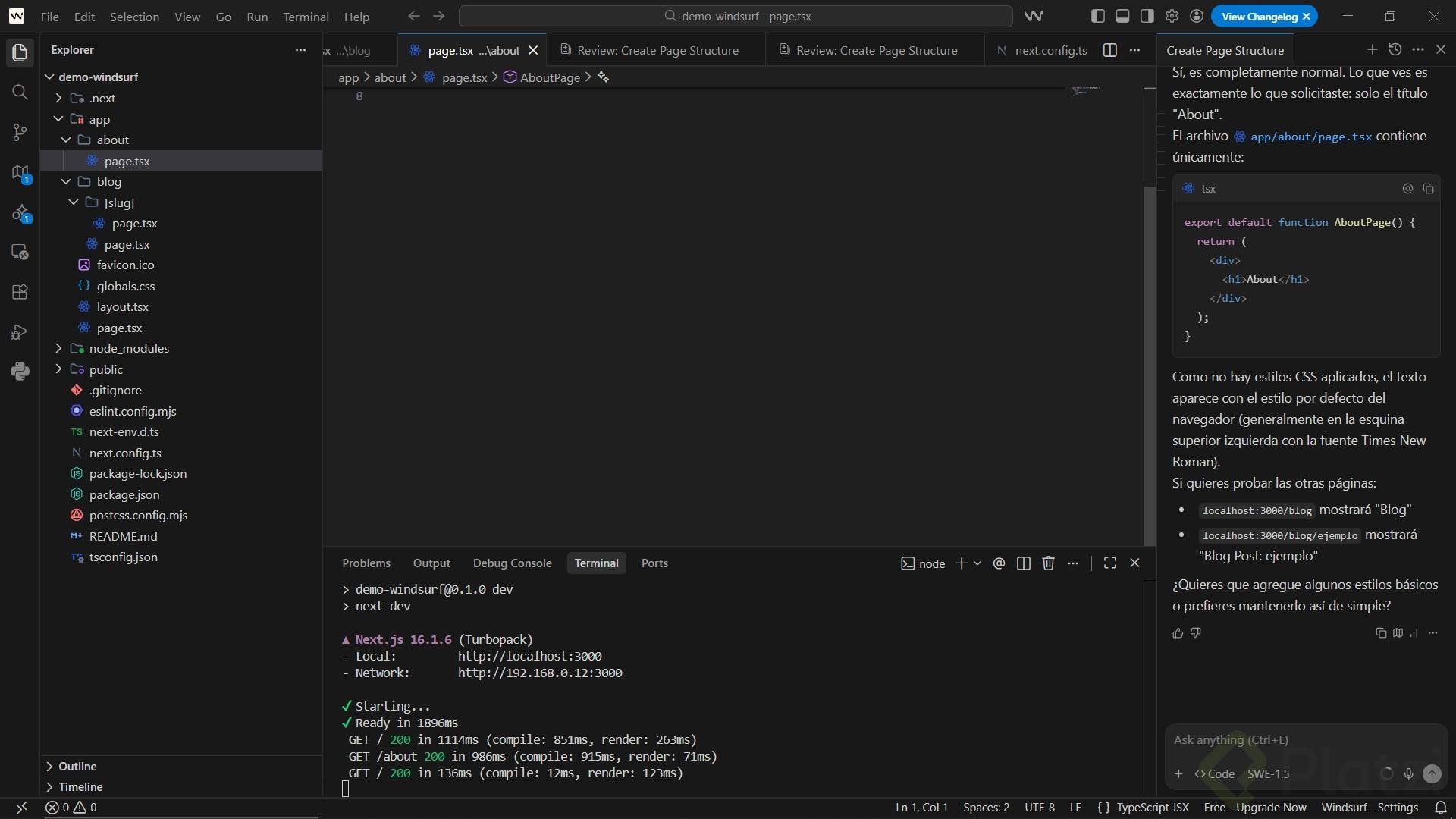 Se creó la estructura bajo la carpeta app dentro de source, incluyendo /about, /blog y /blog/[slug]. El single es dinámico porque depende del slug en la ruta.