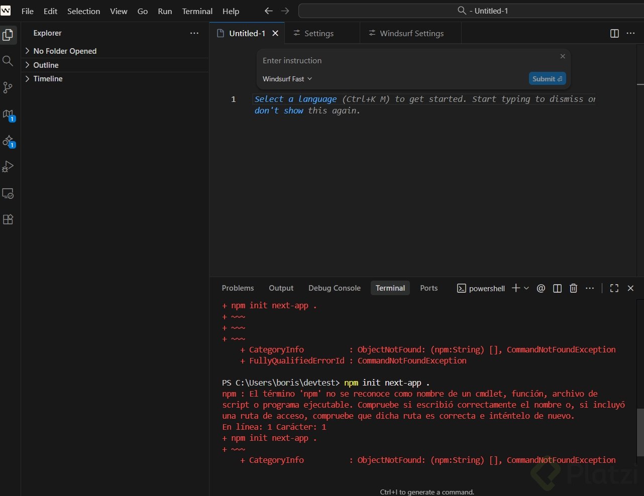 Abre la terminal con Command J o desde el panel. Con Command I o Control I se abre una ventana de chat que traduce instrucciones en lenguaje natural a comandos. Por ejemplo, “instala Next.js en este directorio” devuelve el comando para crear la app en el directorio actual.