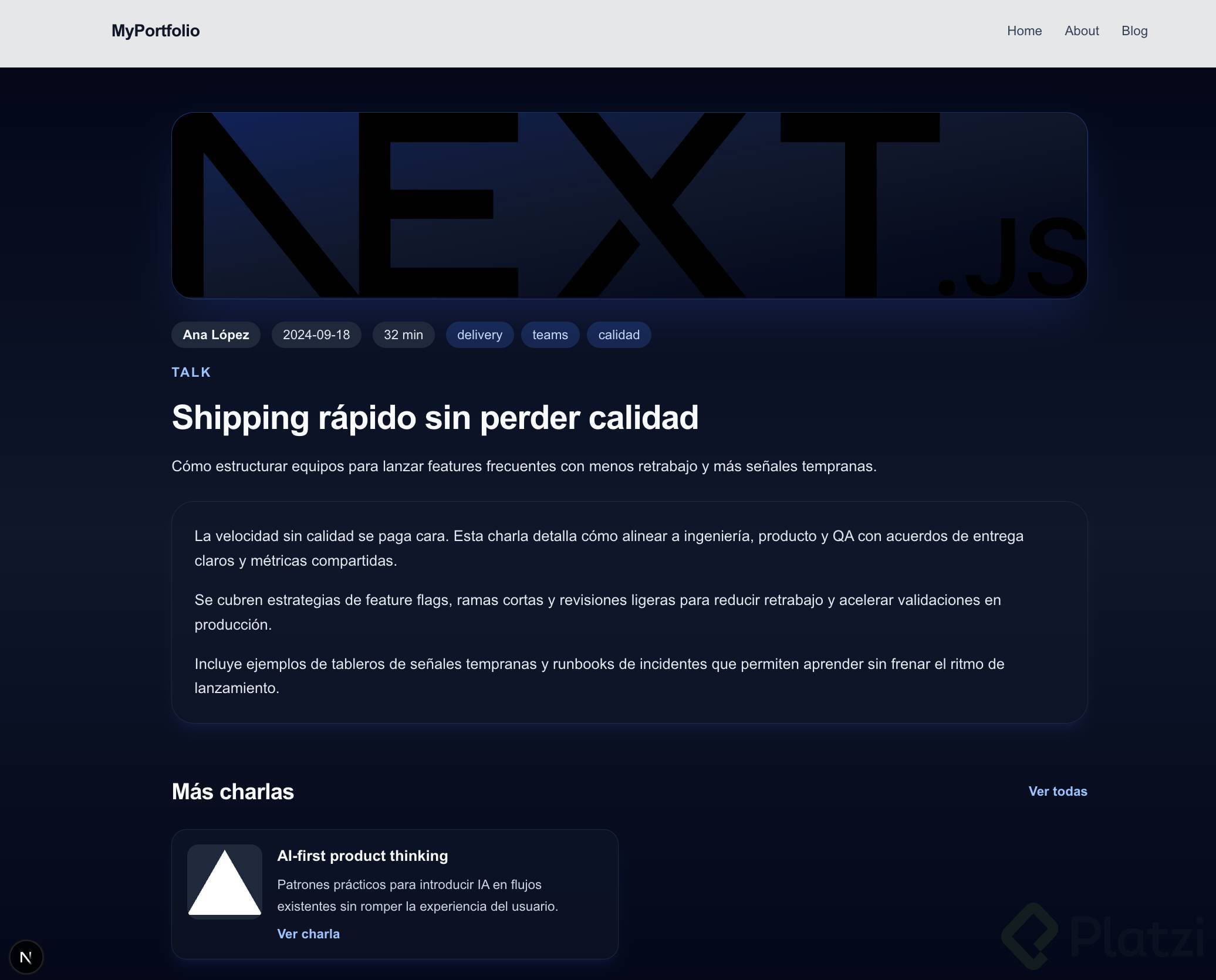 - Contenido: About Me, projects y talks con títulos claros.