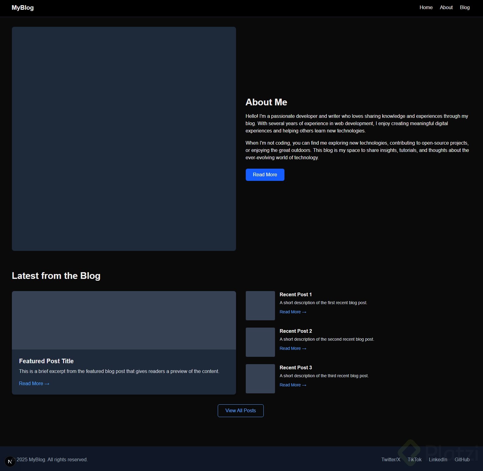 Para validar el resultado se ejecuta el servidor local y se refresca el navegador. Verás que la composición respeta el diseño planteado con solo el prompt: navegación, enlaces, bloque de about me, featured post y listado de posts, además del footer con enlaces de texto.