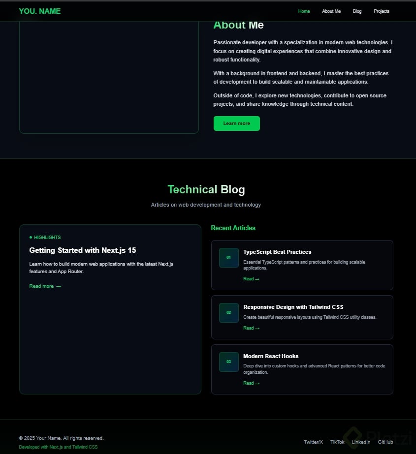 - Footer: enlaces de texto a TikTok, Twitter/X, LinkedIn y GitHub, sin íconos para evitar librerías extra.