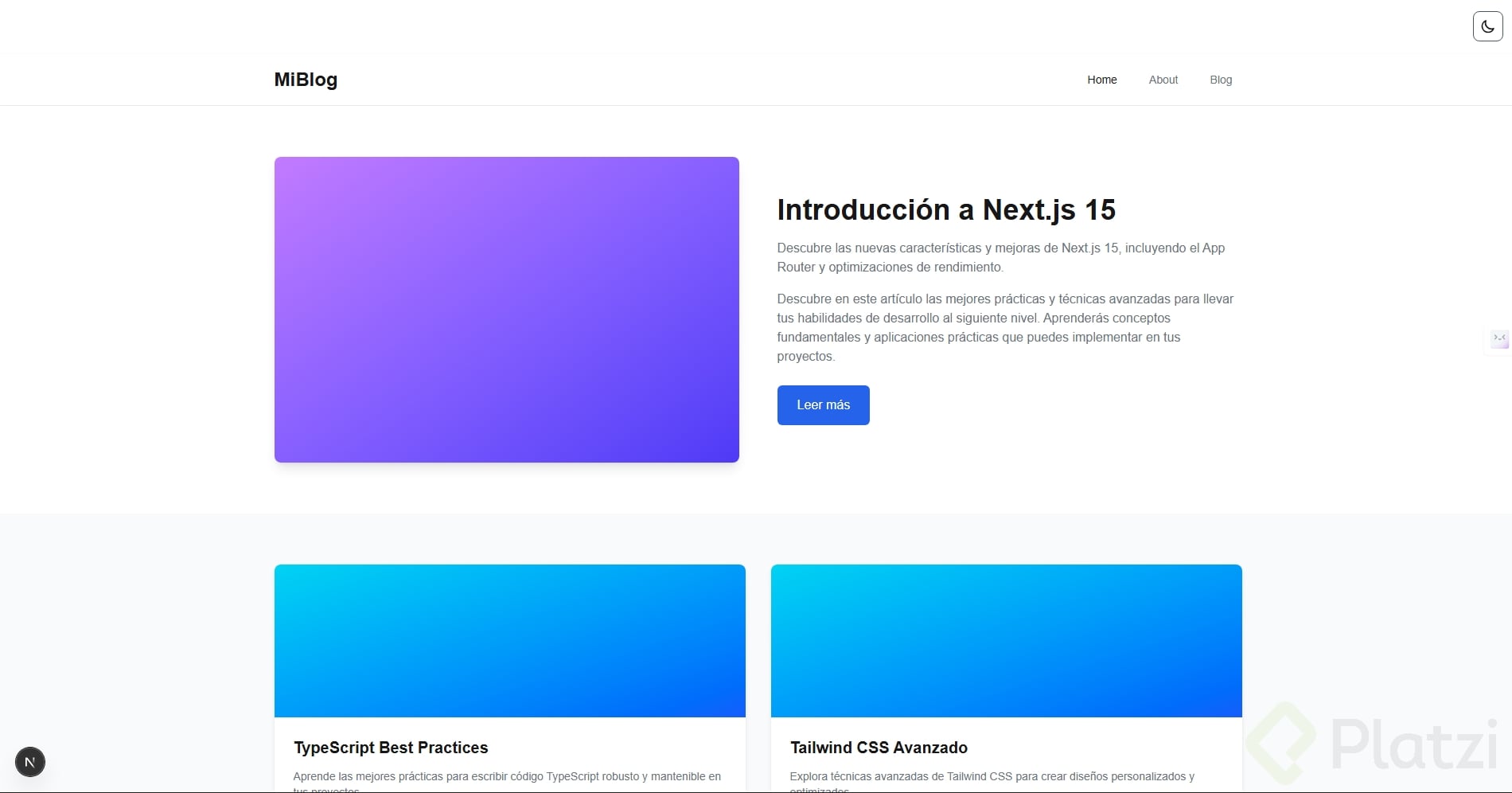 - Hero en dos columnas: imagen grande a la izquierda; a la derecha, título del post, 2–3 líneas de resumen y botón de “Leer más”.