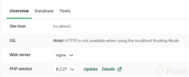 Al completar la instalación de tu sitio local, Local WordPress muestra opciones útiles para el manejo y administración:
