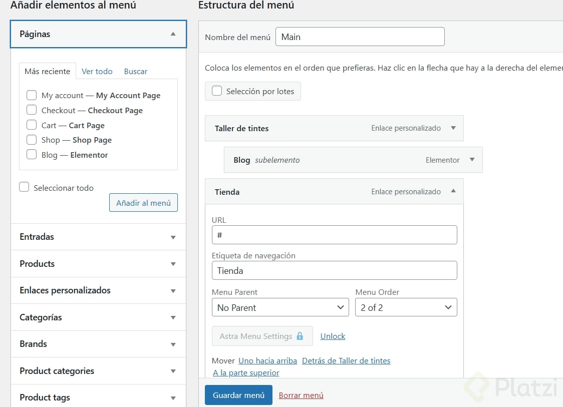 Vuelve a WooCommerce para personalizar el diseño de la tienda. Puedes crear un tema desde cero o elegir uno profesional gratuito ofrecido por WooCommerce. Una vez seleccionado, la tienda se integra al menú principal del sitio. Si el botón “Tienda” no dirige correctamente, revisa el menú de navegación en Apariencia > Menús para asegurarte de que apunte a la página de tienda y no a un enlace personalizado.