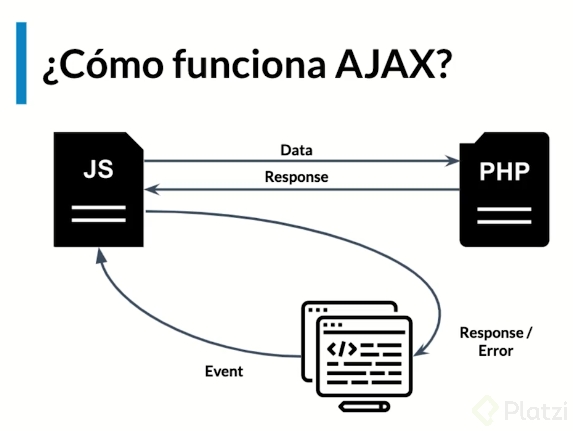 En un sitio web, durante la interacción del usuario, se desencadenan diferentes eventos como clics o cargas de la página. Para manejar estos eventos, un archivo JavaScript escucha y desencadena funciones específicas. Cuando se produce un evento esperado, el archivo envía una petición AJAX al servidor, donde se ejecuta en un entorno PHP. De esta manera: