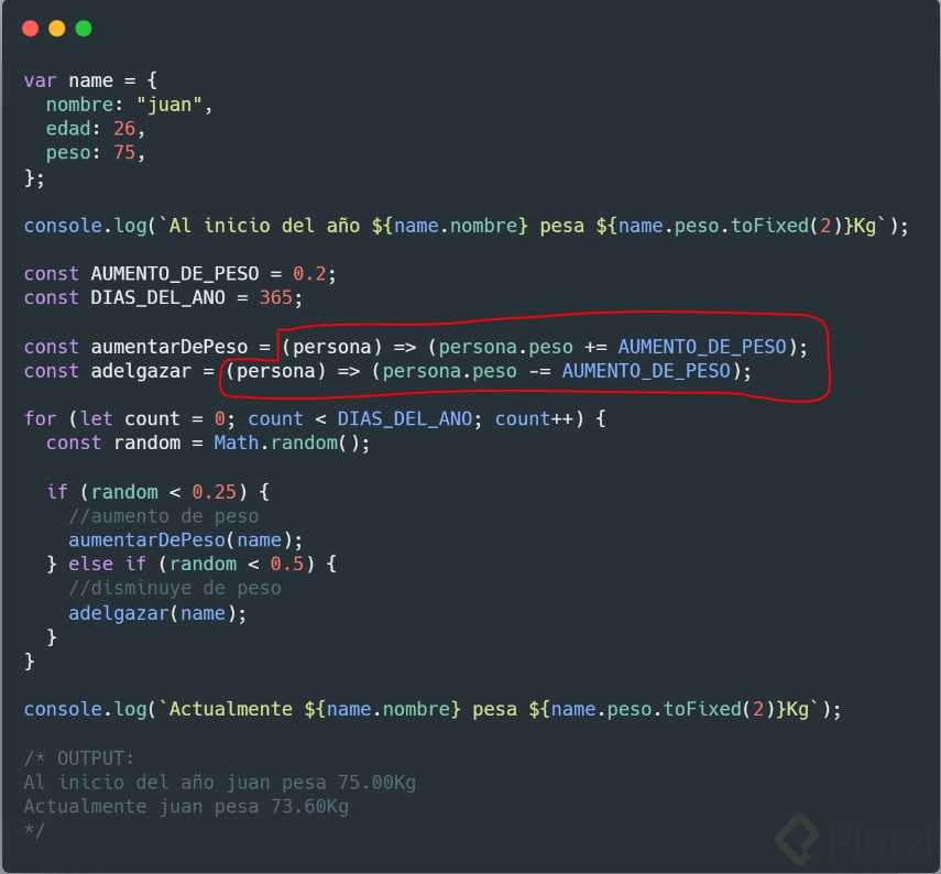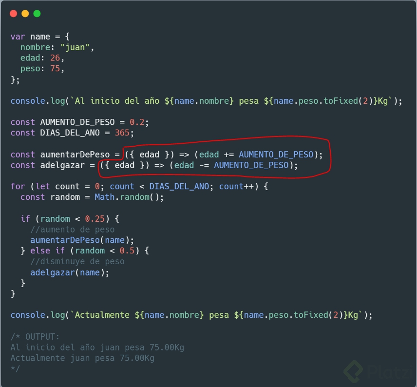 Cuando estas definiendo las constantes "aumentarDePeso / adelgazar" estas tomando la edad de tu objeto persona, por lo cual estas modificando la edad y no el peso