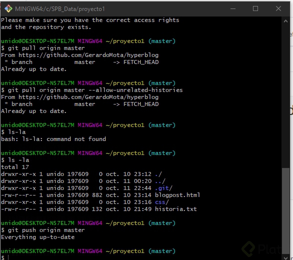 - El segundo pull con --allow también se hizo correctamente y te dice que ya todo está actualizado